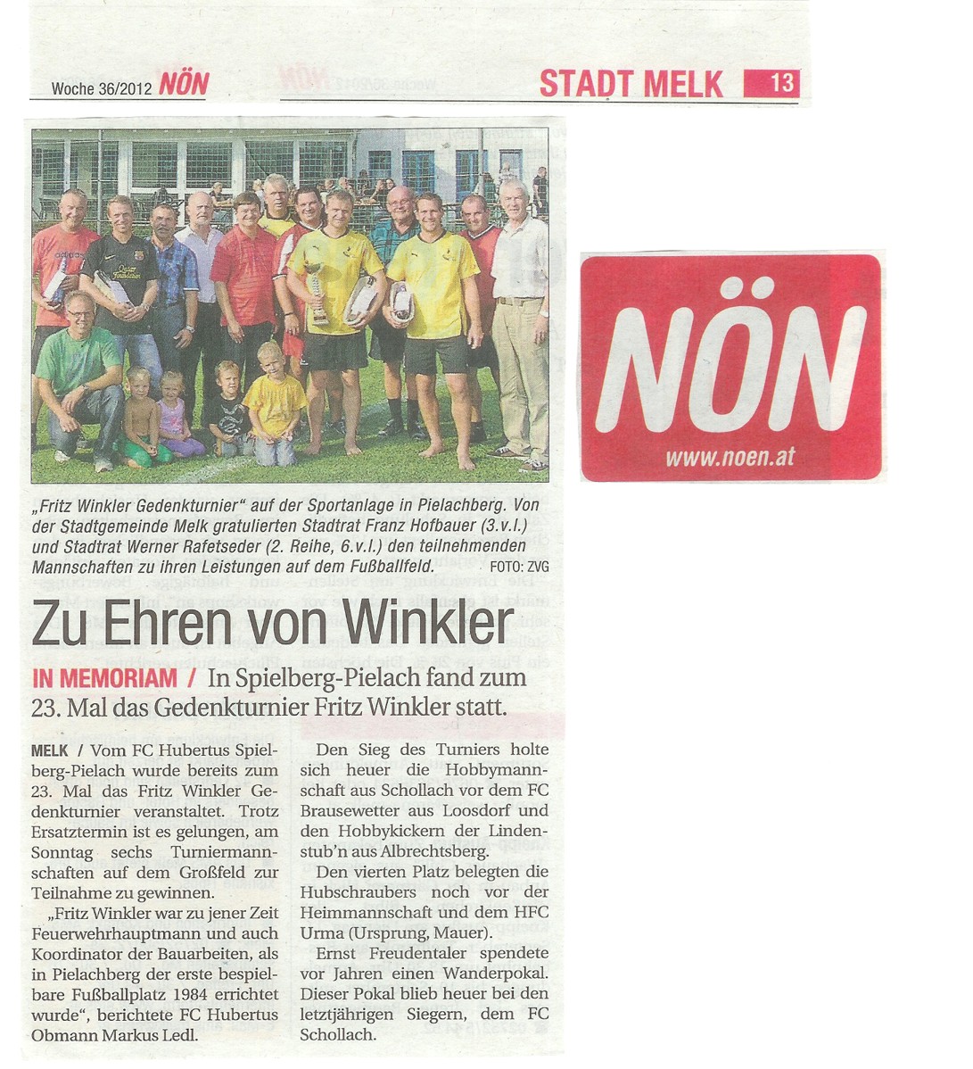 Pielachberg - Bereits zum 23. mal wurde vom FC-Hubertus Spielberg-Pielach das Fritz Winkler Gedenkturnier veranstaltet. Trotz Ersatztermin ist es gelungen, am Sonntag, 2. September 2012 sechs Turniermannschaften auf dem Großfeld zur Teilnahme zu gewinnen. "Fritz Winkler war zu jener Zeit Feuerwehrhauptmann und auch Koordinator der Bauarbeiten, als in Pielachberg der erste bespielbare Fußballplatz errichtet wurde. Bei der Eröffnung dieses "kleine" Platzes im Jahre 1984 spielte eine Dorfauswahl gegen die Feuerwehr. Zwei Jahre später wurde aus dieser Dorfauswahl der Hobbyfußballverein FC-Hubertus." berichtet Obmannstellvertreter Emmerich Raidinger.